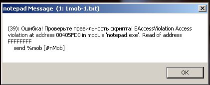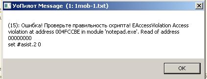 пилот скачал последней версии с месагой от морфика. обновил скрипт, теперь таже ошибка вылетела на send %attack [#nAttack] после 3 часов работы. еще подобная ошибка вылетает на строке set #asist.2 0, если запустить этот скрипт не запустив предварительно 2 скрипт. При этом странно, что ошибка вылетает, на 3 запуска, а на 4 запуск уже запускается скрипт без ошибки. при вылете ошибки лог пишет 7:49:43 1 (1mob-1.txt, 15): - set #asist.2 0, так что я думаю в логе будет тоже самое когда вылетит ошибка на send %attack [#nAttack] и это врядли поможет понять в чем проблема. С рабочими пятью окнами также не получается запустить скрипт и писать все в лог. Думаю, что какой то тут глюк самого пилота.