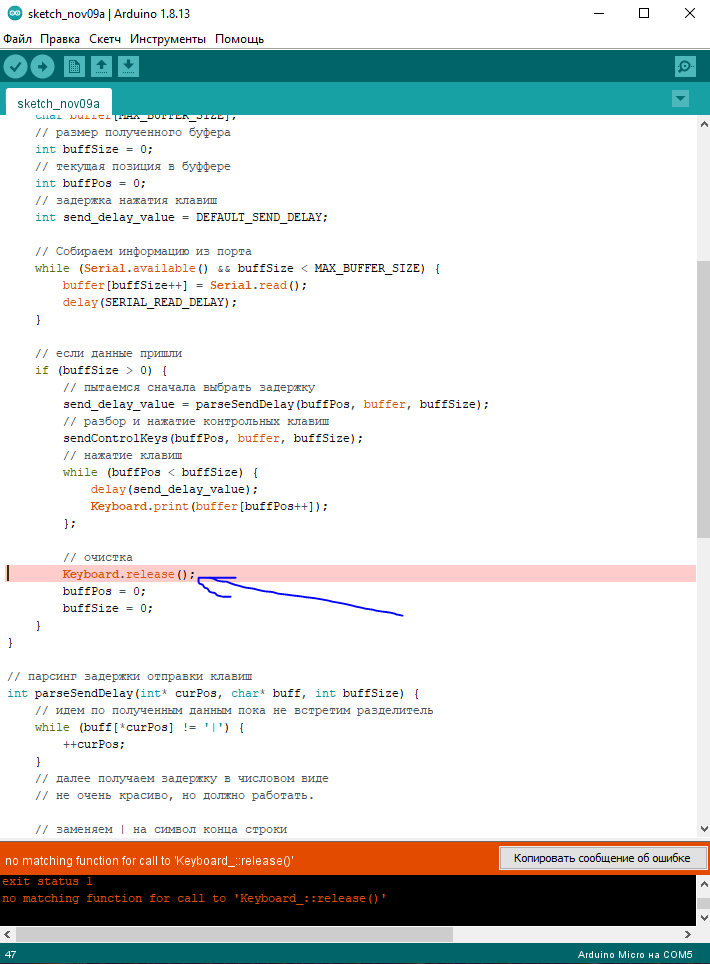 // если данные пришли if (buffSize > 0) { // пытаемся сначала выбрать задержку send_delay_value = parseSendDelay(buffPos, buffer, buffSize); // разбор и нажатие контрольных клавиш sendControlKeys(buffPos, buffer, buffSize); // нажатие клавиш while (buffPos < buffSize) { delay(send_delay_value); Keyboard.print(buffer[buffPos++]); };