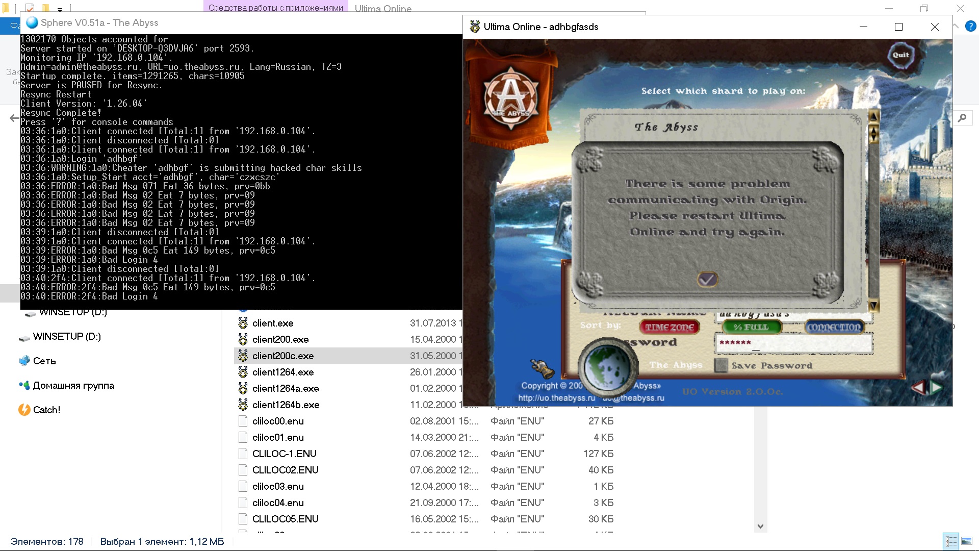 Там ж в консоли видно что Абиссовской сфере не нравятся пакеты клиента и клиент просто дисконнектит. Это потому что они там в клиент вшивали что б определенные пакеты чуть по другому слались, это они такую "защиту" от левых клиентов придумали, лол. Возьмите Орион с файлами абисса и не партесь.