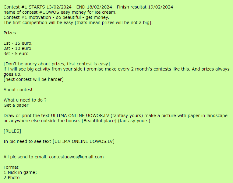 Администрация UOWOS обещает всем нашим игрокам, что мы будем двигаться вперед и разрабатывать больше квестов и нового контента для вас.