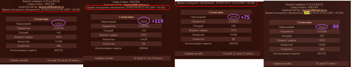 График вообще до нуля бывает проседает, потом спустя время каким-то образом выравнивается, что таких падений не видно в нём. Но что еще интересно в статусе, кол-во персонажей всегда меняется, при том что кол-во аккаунтов остается неизменным: