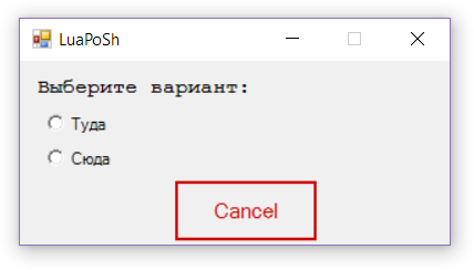 check_prompt ("Вариант 1", "Вариант 2") "Подсказка"(необязательно) Начнем со скучного примера, где мы сами задаем варианты, и не требуется использовать подсказку: --lua log "clear";log"mode compact";require "luaposh" PScode('return',{[[#} # $a = 1