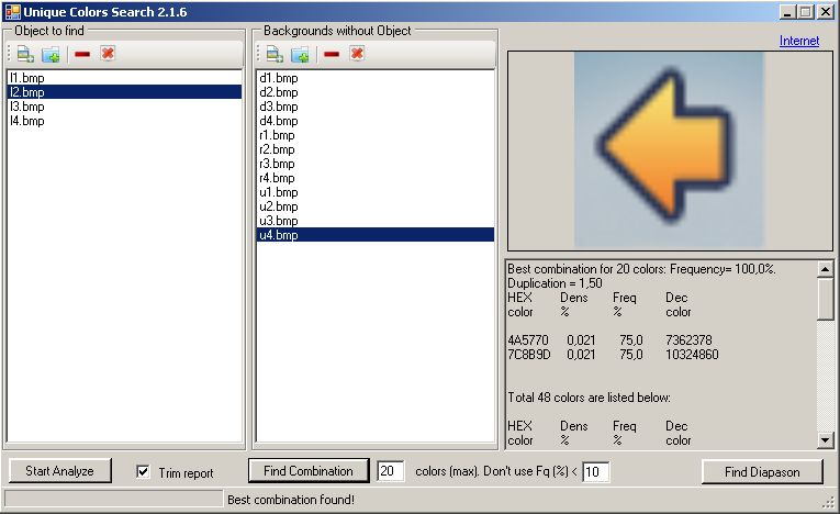 Unique Colors Search 2.2.0Добавлена возможность поиска целых изображений с помощью самого UOPilot (с выборочной степенью проверки совпадения с оригиналом) посредством генерации скрипта поисковой подпрограммы. Уточню: программа проверяет заданный процент пикселей от общего числа пикселей Объекта, и если ВСЕ они совпали с оригинальным изображением, то Объект считается найденным. Пиксели проверяются по всей площади изображения в особом "разбросанном" по всей площади порядке (в таком же, как происходило построение объекта при нажатии кнопки Rebuild points).
