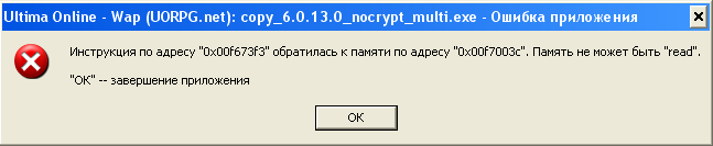 Потестил "демонстрационную" версию. Запускает клиент нормально, коннектится нормально, играть вроде можно, лог пакетов идет. Короче говоря, никаких проблем не обнаружено. (Клиент: 6.0.13.0; Эмулятор: SphereServer 0.56b, одна из последних сборок). По коду сказать нечего, я не программист. (IMG: style_emoticons/default/smile.gif) P.s. А нет, рано порадовался, что проблем совсем нет. При закрытии клиента крестиком гарантировано вылетает вот такое: Сообщение отредактировал wap - 22.12.2010, 17:55