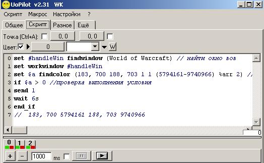 К сожалению пришлось отказаться от такого подхода, так как есть две вещи препятствующие этому. 1 Это ротация не статична, нужно жать для большого ДПС правильную последовательность активных кнопок и особо которые в крите подсвечены. 2 Разный ( значительный) временной интервал но очень важных усиливающих бафов. Как пример приведу Цитата set #handleWin findwindow (World of Warcraft) // найти окно вов set workwindow #handleWin set $a findcolor (30, 60 33, 63 1 1 (14999781-13424346) %arr 2) // условие if $a > 0 //проверка выполнения условия send 1 wait 200 send 2 wait 200 send 3 wait 300 send 4 wait 1500 send 1 wait 200 send 5 wait 200 send 4 wait 1500 send {f1} wait 20 end_if