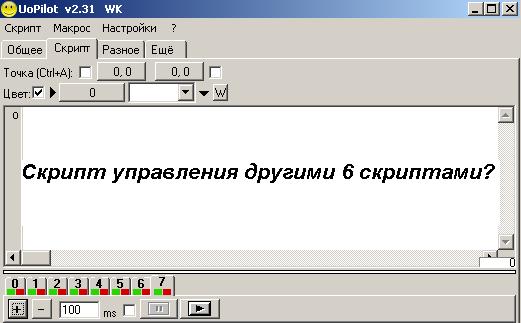 таких кусков может быть несколько, ну для меня достаточно 6 кнопок (IMG: style_emoticons/default/smile.gif) Но вот проблема мне нужно чтоб эти скрипты управлялись еще одним, чтоб он их запускал а останавливались они сами после исполнения. Помогите пожалуйста! (IMG: style_emoticons/default/unsure.gif)  Скрипт управления другими 6 скриптами?  К примеру вот 6ть первых кнопок , на картинках нумерация