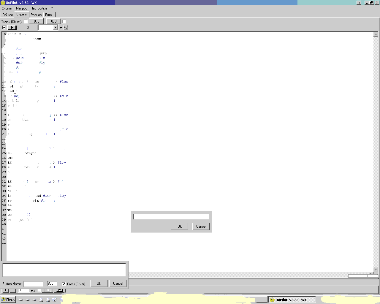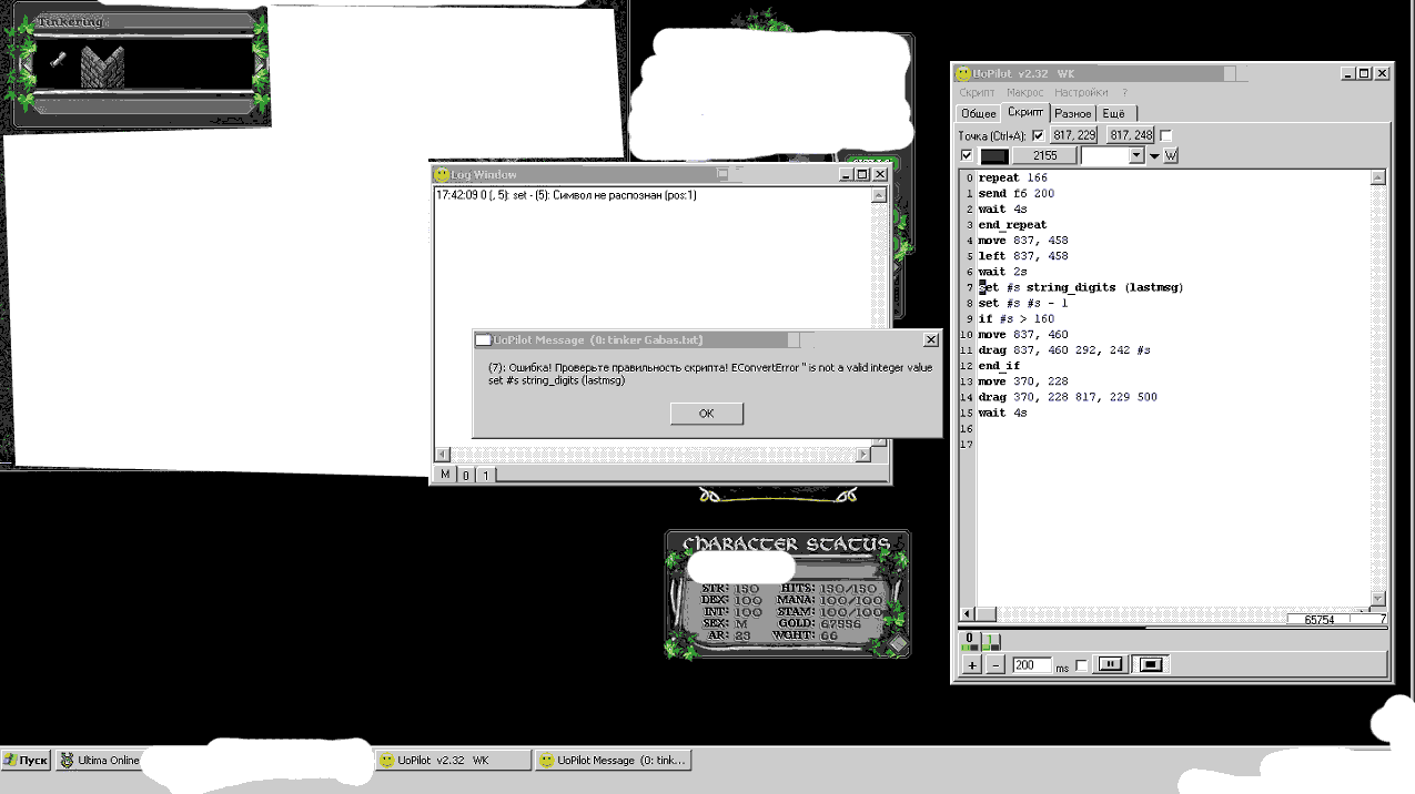 Попыток через 20 при несрабатывающих условиях if ( f6 wait продолжают меняться) на строке if lastmsg <= have выдает ошибку Syntax Error: Exp1 Делал Have переменной, менял строку на while, то же самое. Также часто встречал проблему. При многократном обращении к любым числовым переменным (больше 1000 раз) выдает ошибку, что integer value вышла за пределы. И последнее что нашел: Что это за 2 окна внизу? Разрешение экрана 1280 на 1024.