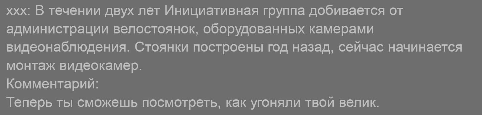 (IMG: http://s47.radikal.ru/i117/1302/0e/de08b9da6fc4.png) Код ххх: В течении двух лет Инициативная группа добивается от администрации велостоянок, оборудованных камерами