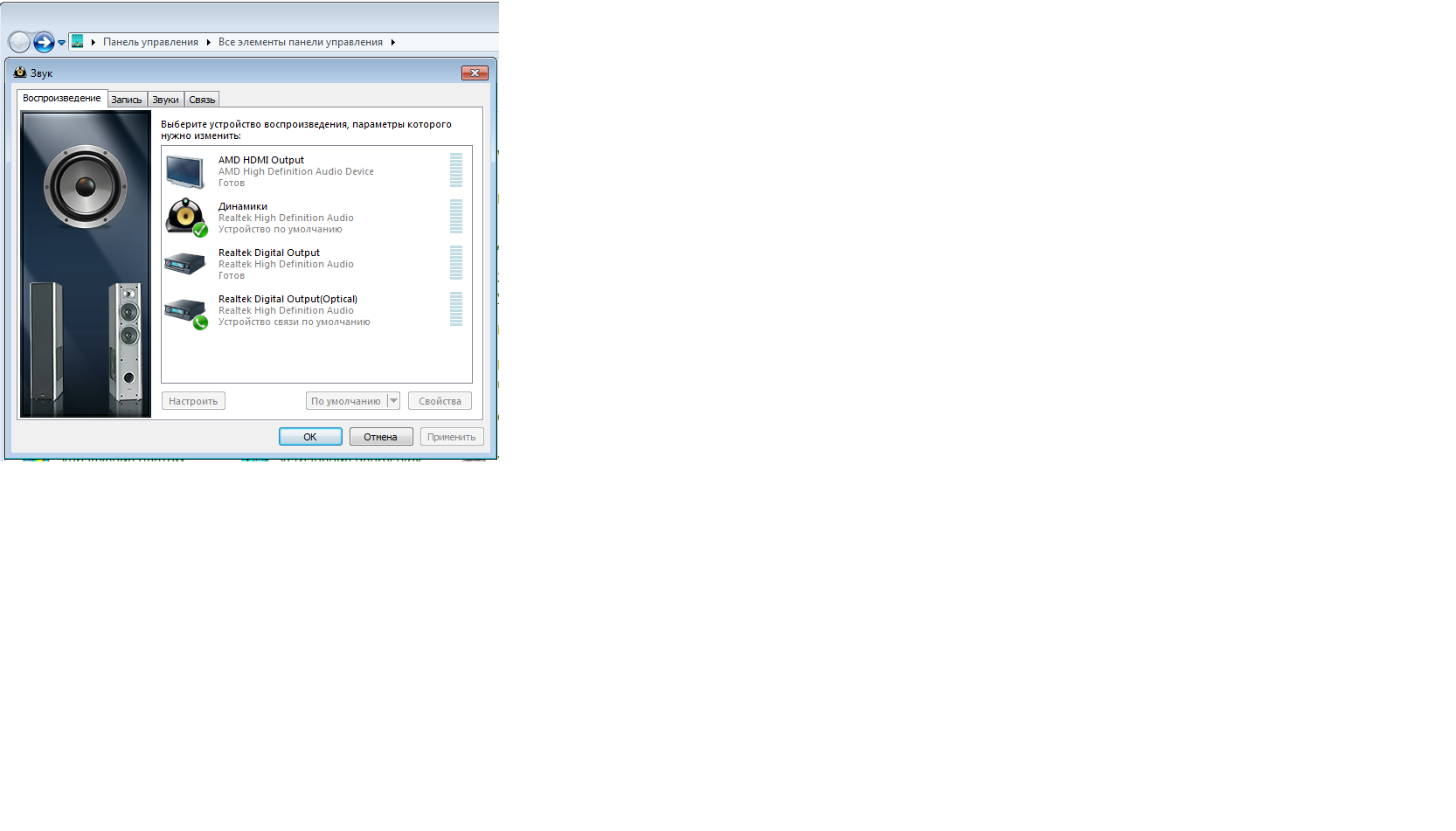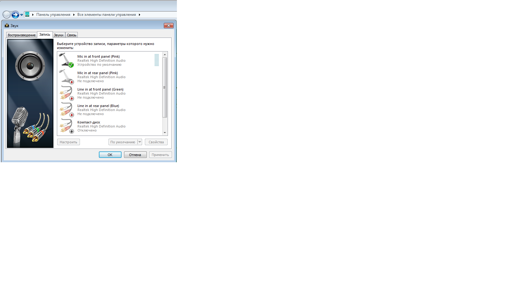 В дровах реалтека нажмите дополнительно, поставьте галку для разделения устройств воспроизведения(или снимите с объединения). После этого снова в панель управления/воспроизведение.
