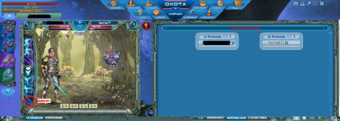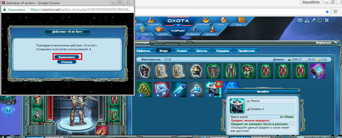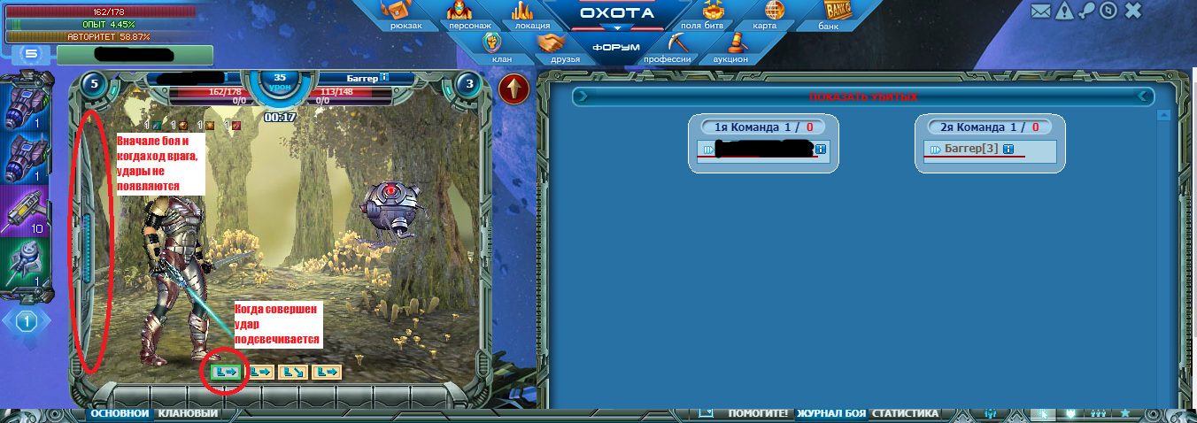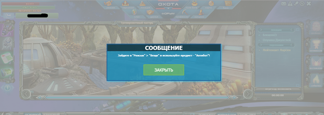 Далее картинка - на ней нужно зайти в рюкзак, нажать в меню рюкзака кнопку "вещи", в этом меню выбрать картинку бота, навести на него мышкой и нажать значок использования (он появляется в правом верхнем углу значка при наведении на него мышкой), заюзав его подтвердить это, нажав соответствующую кнопку в появившемся окне, и вернуться к охоте.
