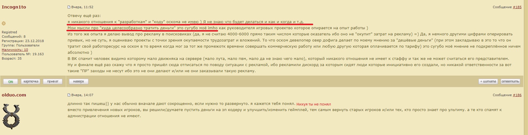 Цитата(Incogn1to @ 26.12.2018, 22:27)  Забавная теория конечно ) Особенно про то что я дал кому-то руль. Вам молодой человек не очень известно понятие "оптимизация информационных потоков" ) Так вот перед собой я поставил задачу в первую очередь сделать удобные ресурс для игроков в котором будет протекать живое общение (сорян, но форум это не живое общение, это динозавр, но да он полезен так как в нём удобно искать).