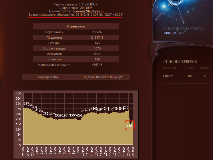 Цитата торговля идёт в мессенджерах В каких? Дискорд только что создали (IMG: style_emoticons/default/smile.gif). Или там у них торговые конференции в скайпе? А что ники, о чем они должны говорить? Или ты за каждый ник можешь ручаться, что это уникальный плеер или пусть там даже онлайн/2 = реальный? Даже судя по статусу, там больше половины игроков без гильдии. Ну и полагаю конечная в этой истории - это график онлайна: Проседания более чем на 150 клиентов, с чего бы? Может там аналогичные акции, за простой дают пачку злотых? Или сами админы стелсят анлим кол-во окон, которое не доступно простым игрокам? Ну сразу на вскидку может был обрыв связи, половина клиентов отвалилась - т.к. не дождалась возврата пакетов, а другая была афк - осталась. Но давай рассуждать логически, при 300 активных игроков, этот параметр вернулся бы на 50% от исходного мгновенно, чего собственно не произошло. А если бы игроки были активными - дисконектнулось бы в разы больше, как и релог был бы в разы больше. Соответственно - я делаю вывод из ряда весом фактов, что - онлайн раздутый, он же фейковый.