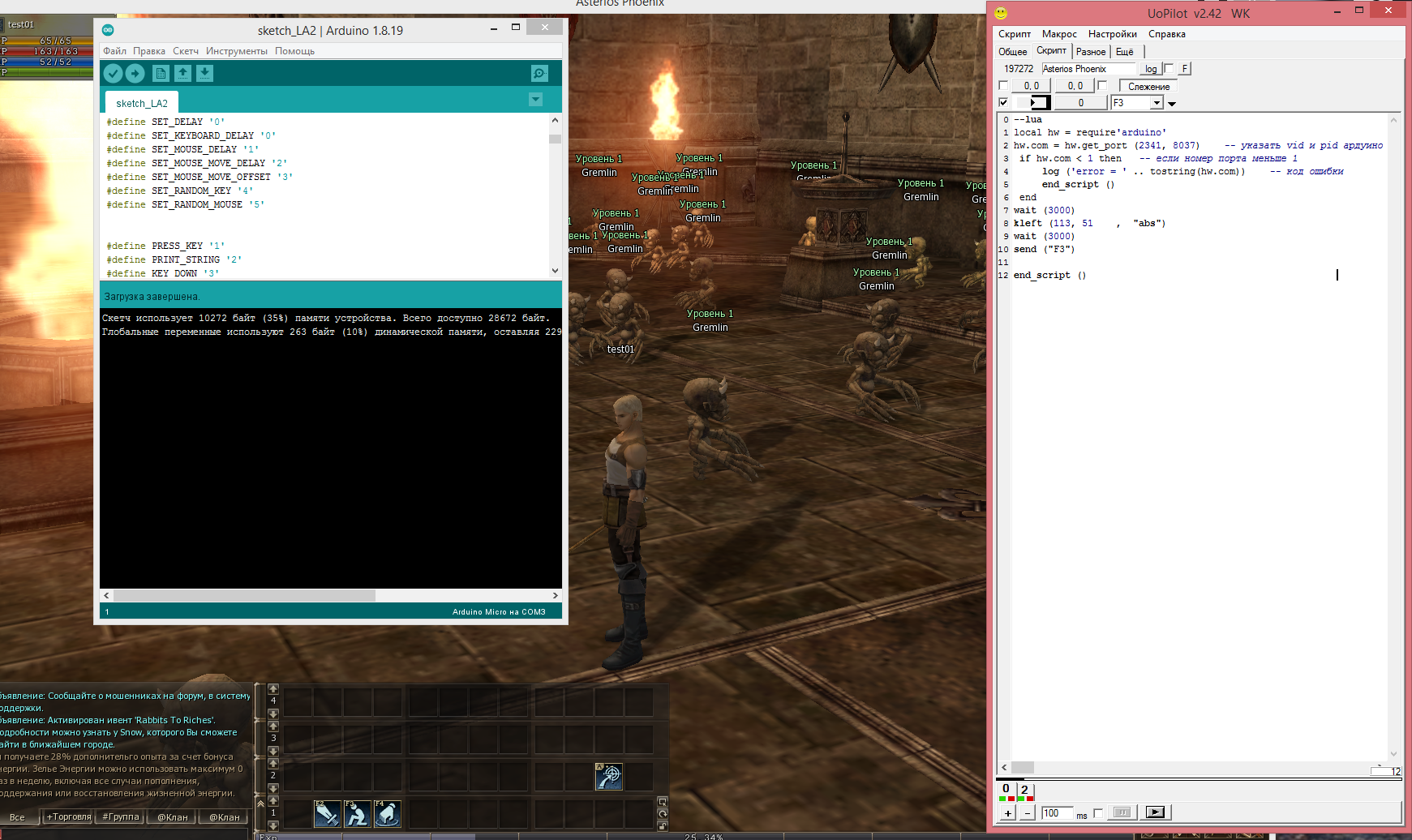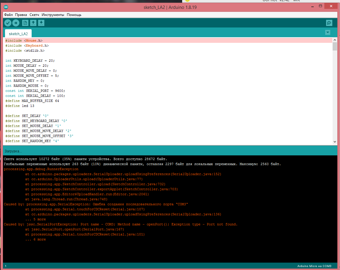 Доброе утро, приобрёл этот дивайс и хотел попробовать, и как всегда возникли проблемы. Небольшой скрипт, при котором мышка переходит в нужную сторону (показывая что скрипт работает). Но вот нажатие клавиатуры не происходит.  Код --lua local hw = require'arduino' hw.com = hw.get_port (2341, 8037) -- указать vid и pid ардуино if hw.com < 1 then -- если номер порта меньше 1 log ('error = ' .. tostring(hw.com)) -- код ошибки end_script () end wait (3000) kleft (113, 51 , "abs")