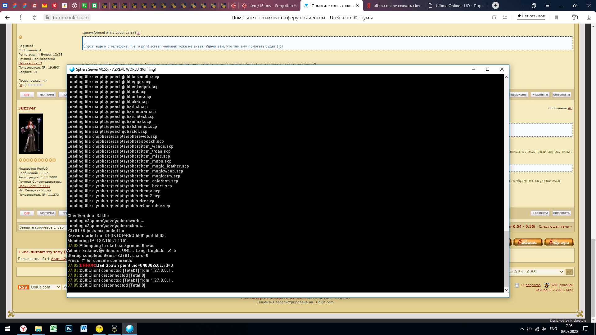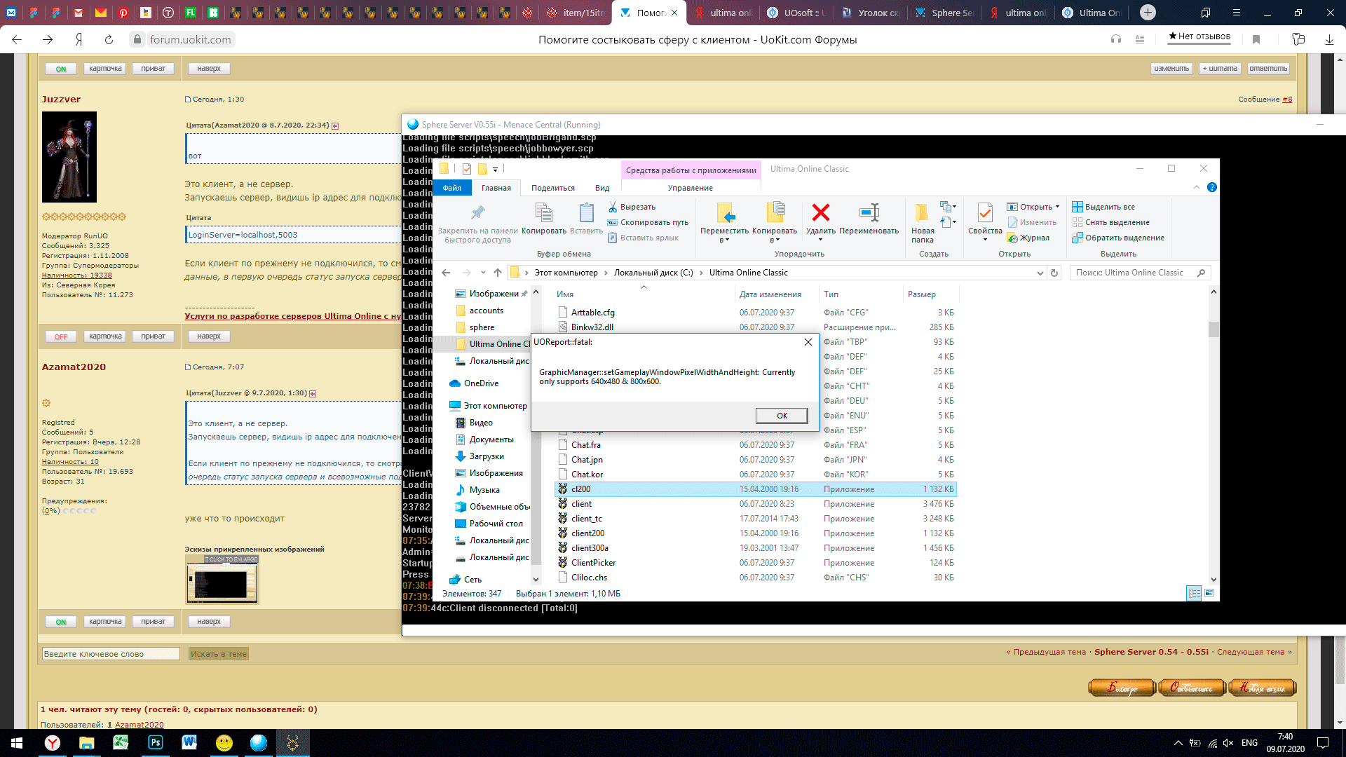В качестве решения, скачайте где-то на торренте Reneissance сборку уо, где будет 2.0.0 или 2.0.3 клиент из коробки и используйте его. Скорее всего вы так же не зайдете на нём на сферу, т.к. будет отсутствовать шифрование. Для этого вам придется воспользоваться вышеупомянутыми рекомендациями для настройки шифрования на стороне сферы или же просто использовать вспомогательный софт, типа Injection, который поможет убрать шифрование для вашей версии клиента, или же Necro Toolz(вроде так она называлась), которая перепрошьет client.exe файл и вырежет из него шифрование, после чего сервер начнет пропускать коннекты с этого клиента.