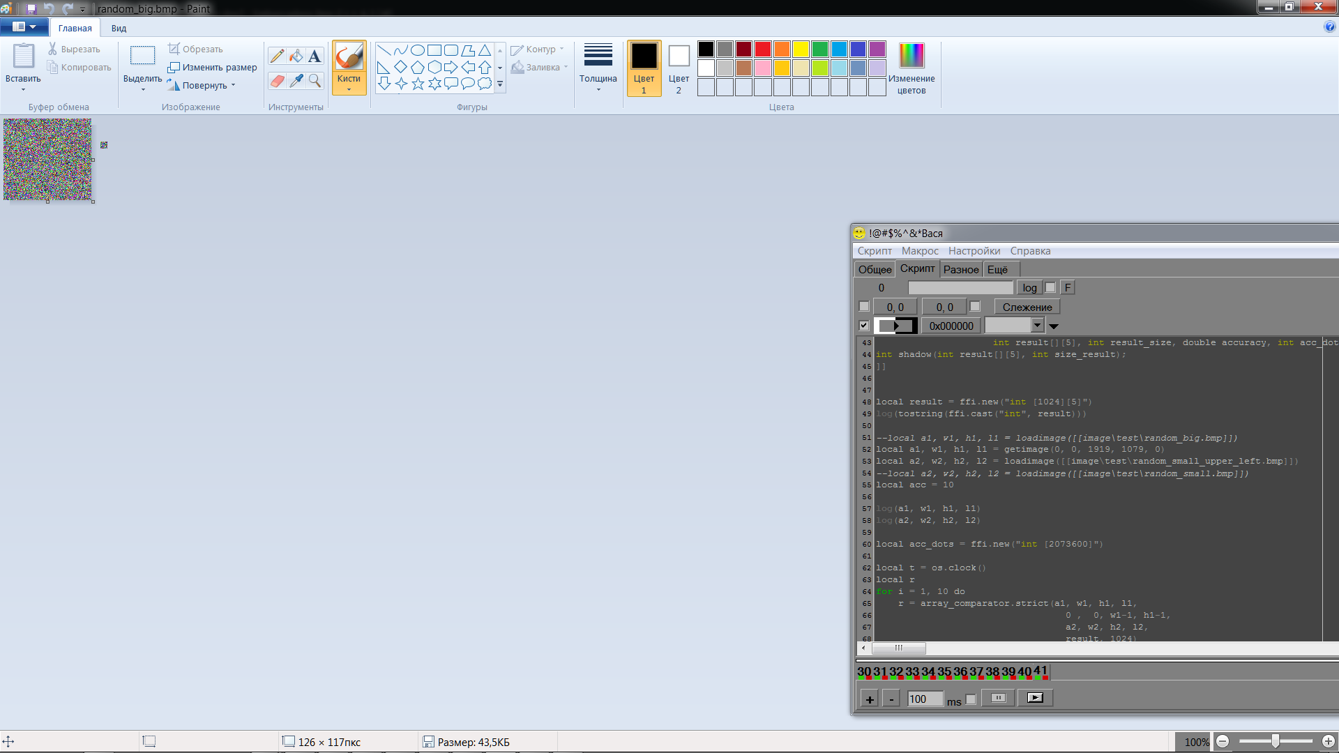 Цитата Условно, в стандартном варианте это O(n^4), т.к. 4 цикла вложенных. Сделая O(n^3) или еще лучше - O(n^2). разворачивание вложенных циклов привело лишь к увеличению времени работы. Делал разные варианты (сейчас есть 8 штук и еще один на луа) вплоть до двух goto без форов и прозрачного вычисления следющего указателя. Смысла в этом не оказалось. Вцелом скорость сносная - 28мс на грубый перебор паттерна 10*10 в скрине 1920*1080 с дико древнем камнем q9600. Да, хотелось бы нолик убрать, а в идеале получить ~2мс на 15*15, но думаю, что это не очень реально - просто тактов даже при идеальном коде не хватит. У меня есть ряд идей по ускорению поиска, которые могут привести к скорости значительно выше, но при этом не будет соблюдаться правило строго порядка слева->направо, сверху->вниз, могут быть пропуски. Т.е. это шустрый вариант когда нужно выдернуть любое подходящее изображение в некоторой области (по факту не менее 90% поиска именно такие). Ну и многопоточку никто не отменял. Но все попорядку - нужно базу иметь адекватную. А в базе дикий вынос мозга ибо война с компилятором (IMG: style_emoticons/default/smile.gif)