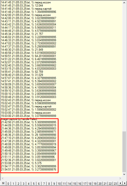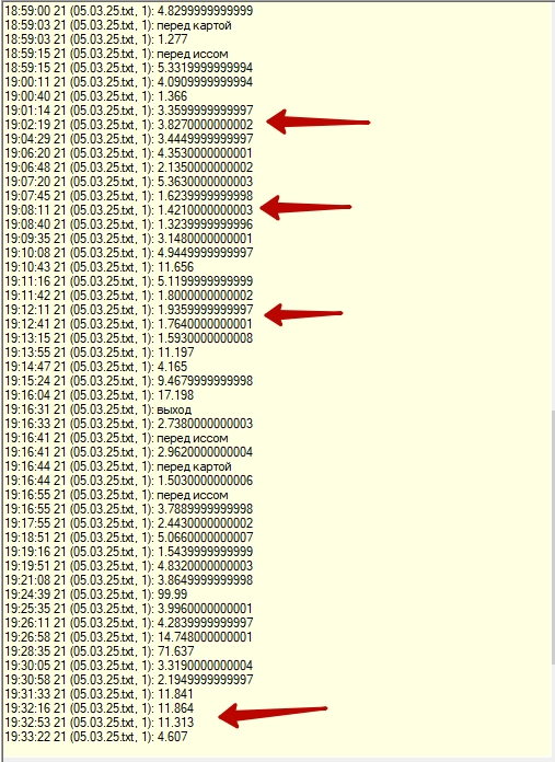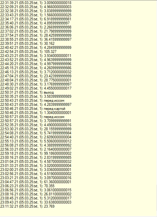 Цитата(DarkMaster @ 12.3.2025, 17:19)  попробуйте в качестве эксперимента перед вызовом таймра вставить следующий код: Код math.randomseed(os.time()) -- это должно быть вызвано только один раз. в цикле не использовать. ... -- этот кусок добавьте перед вызовом time.sleep_random_g for i=1, math.random(100) + 50 do math.random() end Вот лог за 12 минут работы